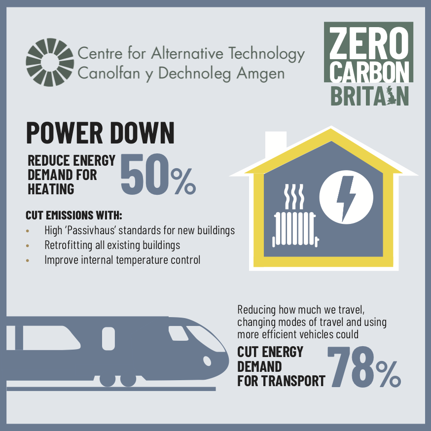 Zero Carbon Britain: Rising to the Climate Emergency explores how we can do what we know is necessary, clearly demonstrating that we already have all the technologies we need to achieve net zero. By making changes to our buildings, transport systems, land use and behaviour, and by investing in a variety of renewable energy technologies, we can achieve a zero carbon transition while building in a wide range of additional benefits. The report provides a blueprint to open new conversations around the scale and speed of change we need to deliver if we are to rise to the climate emergency. It can be used as a template to help citizens and local and national policymakers develop and deliver zero carbon action plans. By using energy more efficiently we can power down demand by 60%.