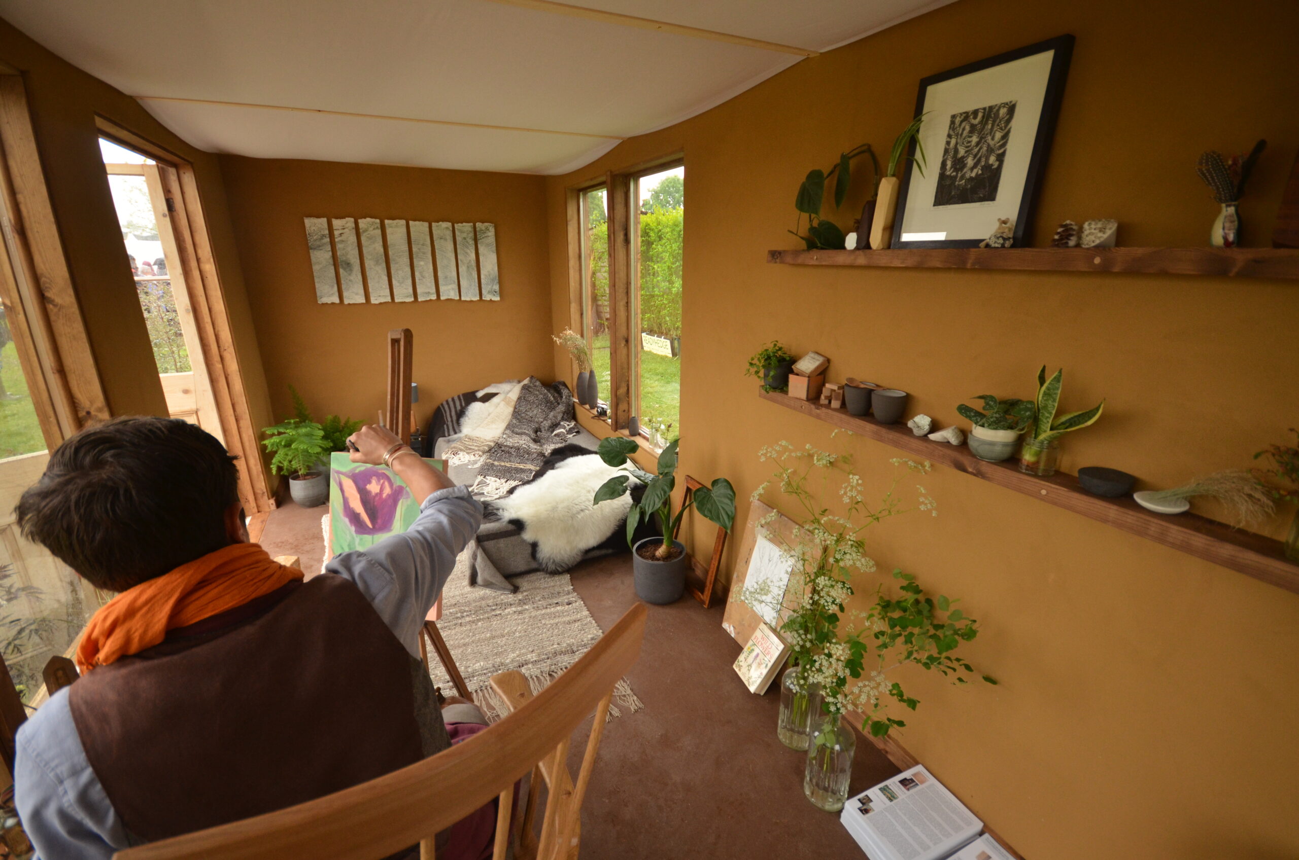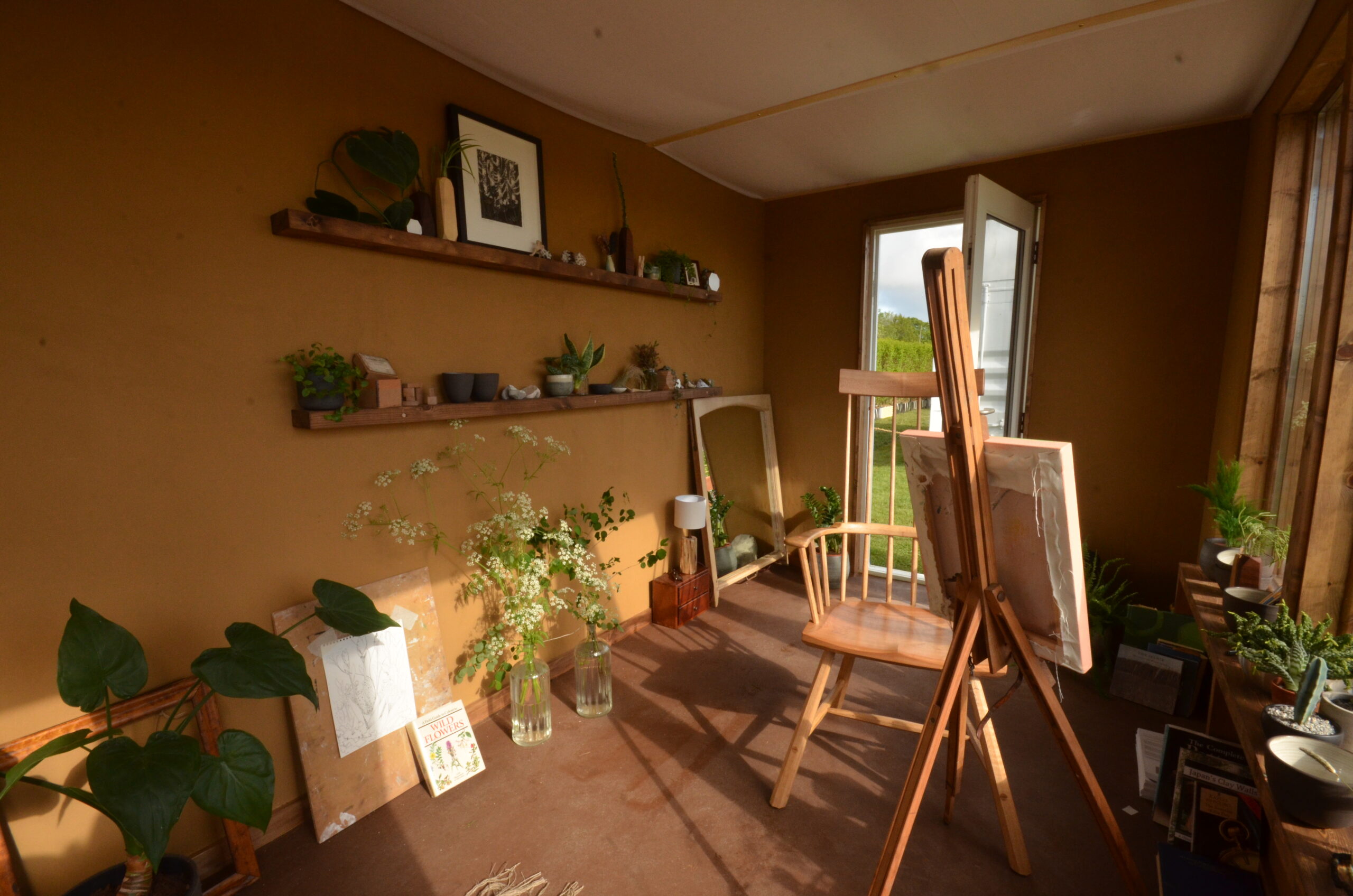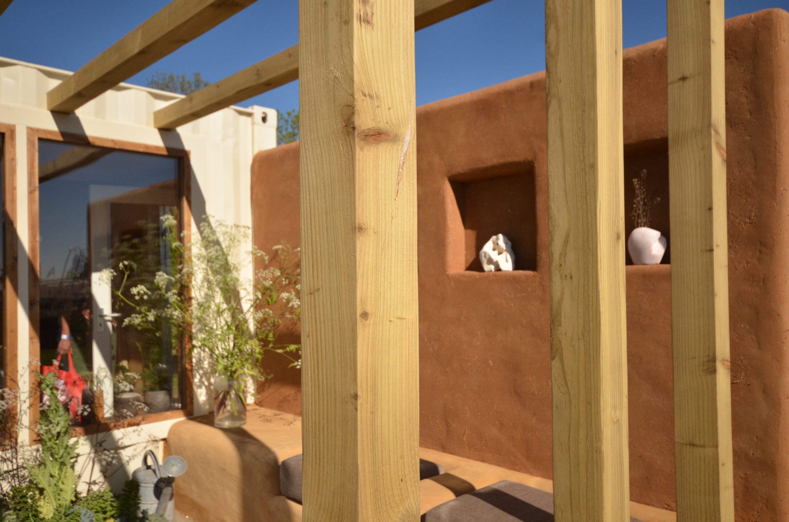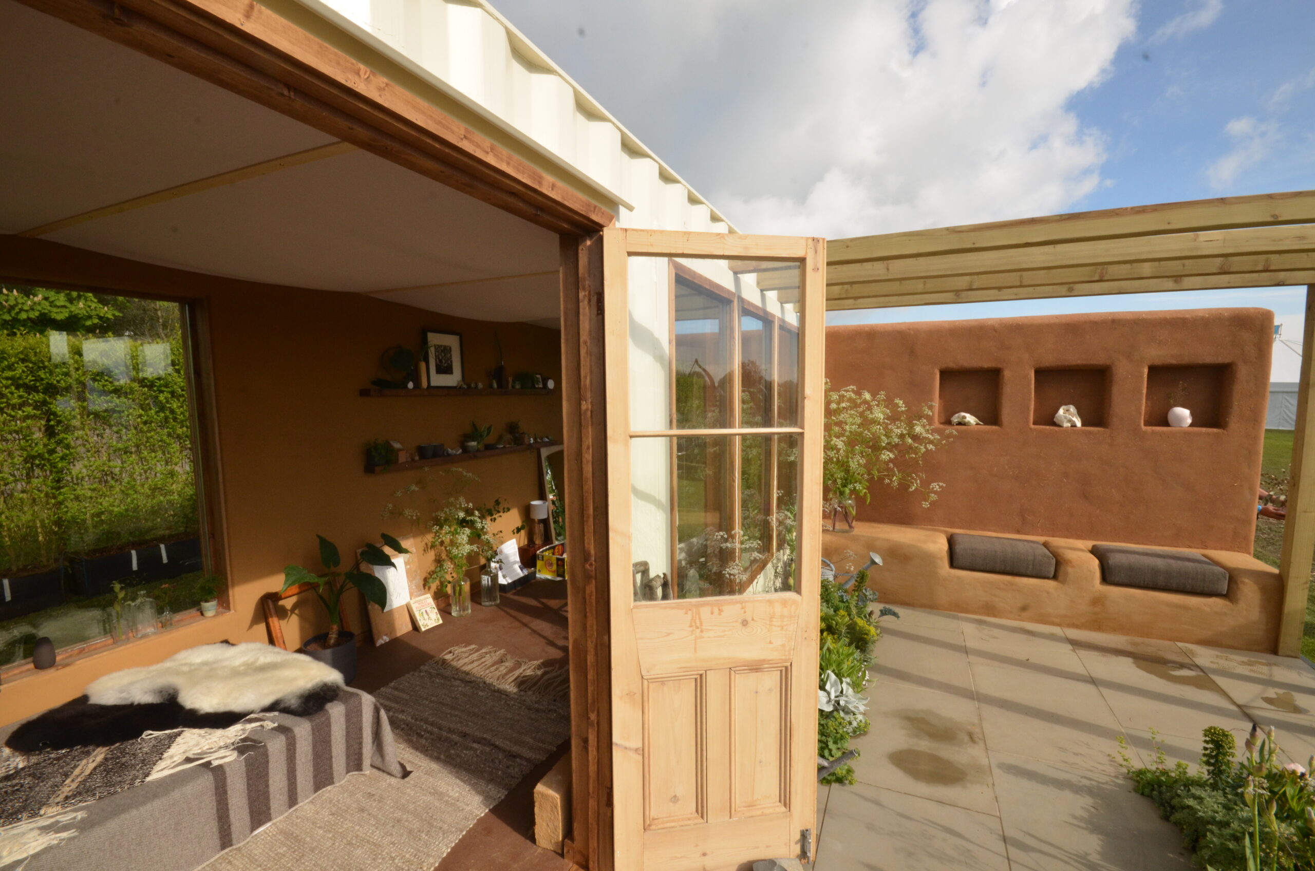 The exterior consists of a cob wall, with clay render and cob bench seats.