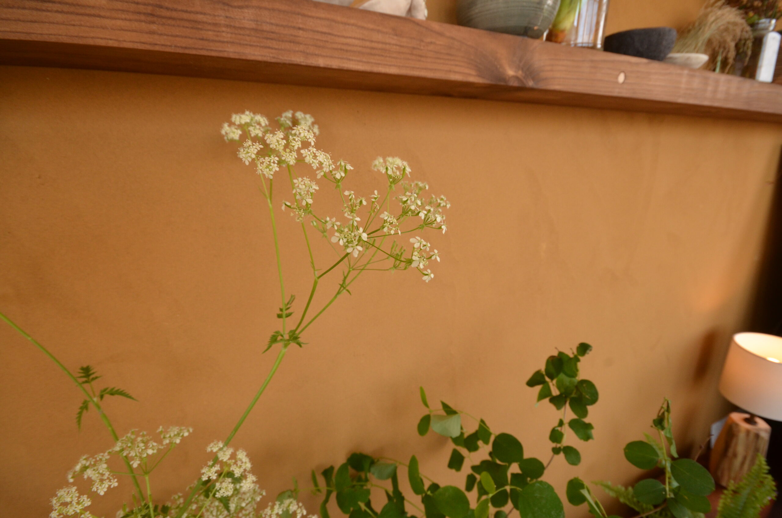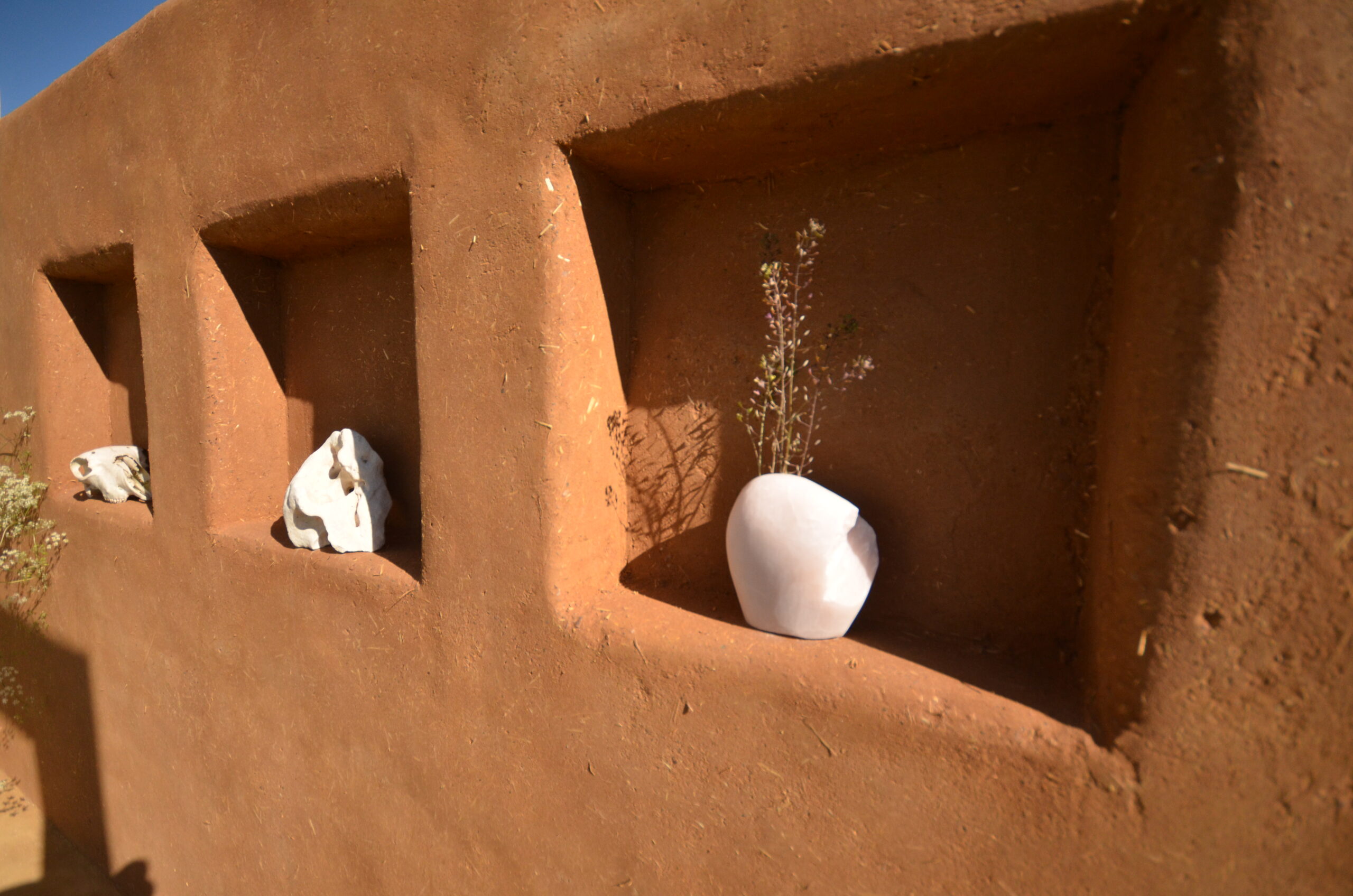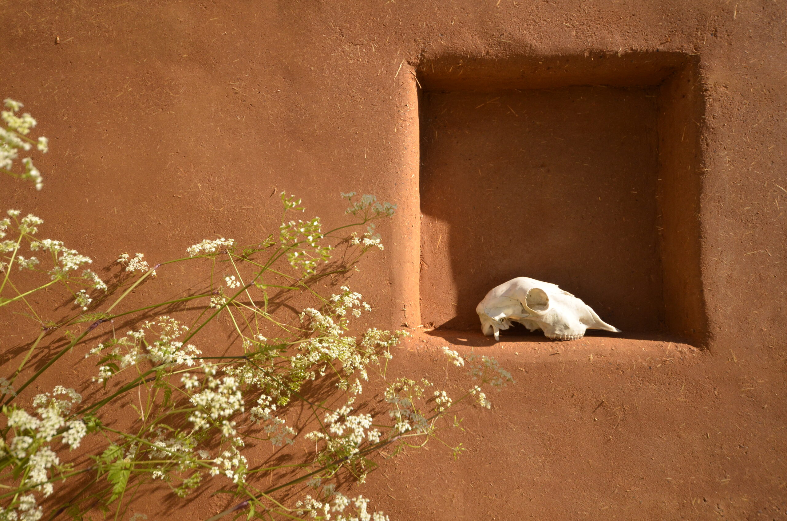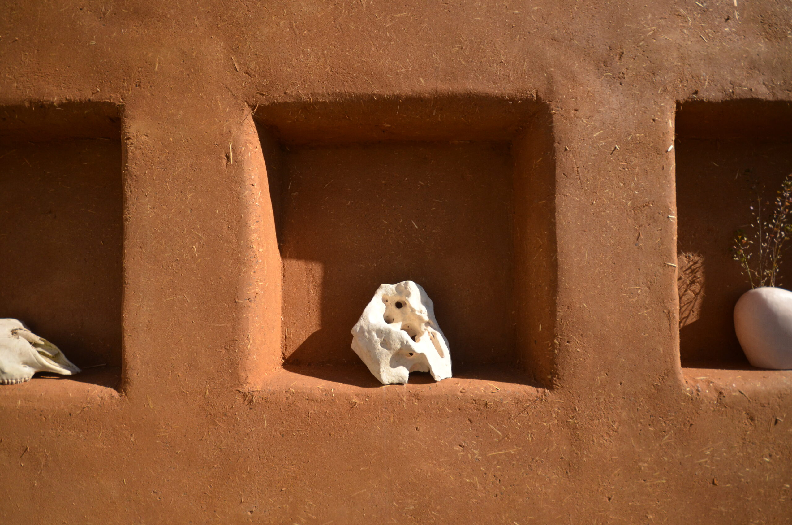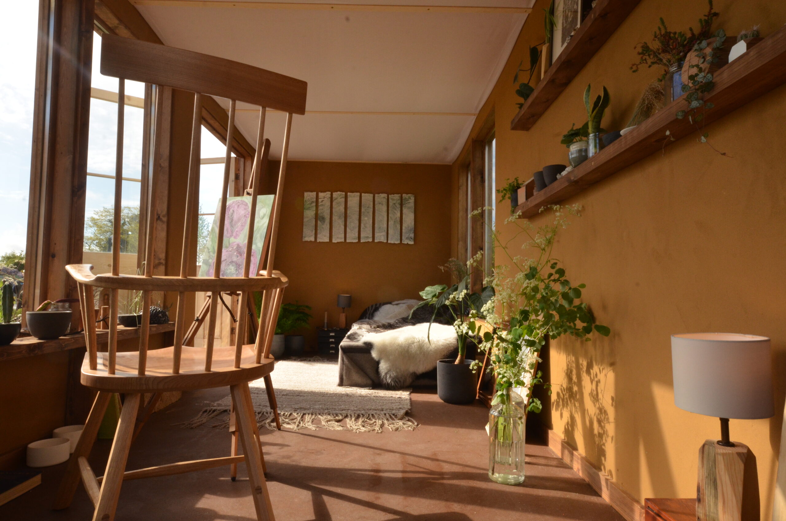 The exterior consists of a cob wall, with clay render and cob bench seats.